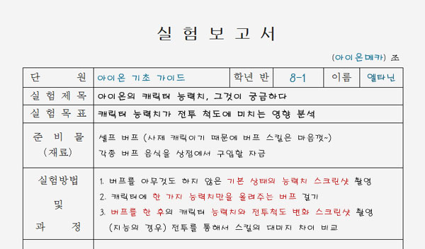 지력은 8가지 캐릭터 정보창의 능력치 중에서 유일하게 마법 외곬수의 성향을 가지고 있습니다. 하지만 그 능력치의 효과를 일반 전투척도를 통해서 찾아보는 것은 불가능했습니다. 마법 공격력에 대한 부분이 캐릭터 정보창에는 존재하지 않았기 때문이죠. 그래서 저는 지력이 가진 효과를 알아보기 위해, 두 가지 의문점에 대한 실험을 진행했습니다.