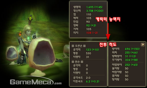 글: 게임메카 엘타닌 자신의 아이템에 특정 능력치를 지닌 마석을 박아 캐릭터를 꾸밀 수 있었던 것은 CBT 시즌2의 아이온이 보여준 큰 변화 중 하나였습니다. 그러나 캐릭터를 구성하는 능력치의 정확한 효과를 알 수 없었기에, 선뜻 어떤 마석을 사용할지 결정하지 못해 막막한 느낌을 받을 때가 자주 있었습니다. 타 온라인 게임들처럼 캐릭터 정보창의 능력치 명칭에 마우스를 대면 그 효과에 대한 설명이 나오는 기능이 없을 뿐더러, 아직 각 능력치에 대한 제대로 된 가이드가 공개되지 않았기 때문에 더욱 그러했던 것 같습니다. 결국 이 능력치들의 효과를 제대로 알아보려면 직접 자신이 마석을 박거나 각종 버프를 통해서 실험해보는 방법 뿐이더군요. 그래서 간단한 실험을 통해, 각 캐릭터 기본 능력치들이 전투 척도(공격력, 방어력 등)에 미치는 영향을 알아보았습니다.