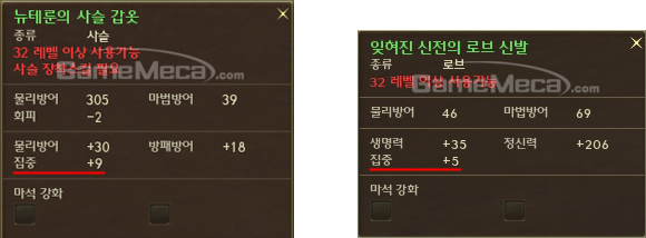 집중. 아마 전사, 정찰자 계열을 플레이한 유저분들께 "이런 능력치도 있었나?"는 취급도 받는 이 왕따 능력치의 정체는 무엇일까요? 이 능력치는 위의 그림 비교와 같이 로브/사슬 계열 방어구와 마석에서 주로 발견할 수 있습니다. 전사나 정찰자 계열 유저분들이 집중의 존재를 잘 모르시는 것도, 사용 방어구의 계열이 완전히 틀린 탓에서 나오는 자연스러운 현상이라 볼 수 있을 겁니다. 이 능력치가 하필이면 로브/사슬에서만 볼 수 있었던 이유는, 지력 외의 또 다른 캐스터용 기능을 가지고 있었기 때문입니다. 아이온의 전투 시스템에는 마법계열 클래스가 마법을 시전할때 공격을 받으면 일정 확률로 캐스팅 자체가 취소돼버리는 판정이 존재합니다. 그러나 끊을 수 있다면, 끊김을 막는 방법도 존재하는 것이 당연한 법. 그러한 의미에서 집중은 "마법 캐스팅이 적의 공격에 의해 취소될 확률"을 줄여주는 보정치의 역할을 하고 있다고 정의할 수 있는 숨겨진 능력치 입니다.
