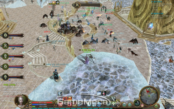 ▲ 꾸역꾸역 모여드는 천족. 오른쪽 하단 채팅창에 반격을 주도한 `힐데브란트`의 외침이 보인다 천족이 ‘모르헤임 요새’를 장악하긴 했지만 마족은 역시 마족이었다. 시즌2 내내 그랬듯이 단합된 마족은 승리에 도취해 있던 천족을 하나 둘 각개격파하기 시작했다. ‘모르헤임 요새’에서 바로 부활할 수 없었던 천족은 머릿수에서 차차 밀리기 시작했고, 마침내 마족은 ‘모르헤임 요새’를 탈환했다.