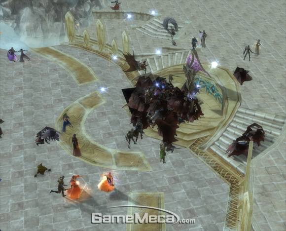 ▲ 엘테넨 요새 앞까지 몰려온 마족(붉은 글씨)과 방어중인 천족 아발론 레기온의 `힐데브란트` 어떻게든 엘테넨 요새가 통째로 마족에게 유린당하는 참사는 막을 수 있었지만, 본진까지 위협당했다는 것 하나만으로도 천족에게 충격과 굴욕이었다. 천족은 이런 마족의 공세에 치를 떨었다. 그러나 시즌2 마지막 날까지 이런 세력 구도는 크게 변하지 않았다. ‘아이온’ 시즌2 내내 천족은 수적으로는 우위임에도 불구하고 마족에게 고전하는 상황이었다. 그러나 천족도 손 놓고 있지는 않았다. 천족 역시 수적우위를 이용해 나름대로 열심히 맞서 싸웠다.