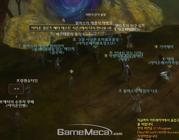 그리고 마침내 ‘아이온’ 시즌2 테스트를 종료한다는 공지가 게임 내에 떴다. ‘아이온’ 시즌2 종료 시각인 4월 27일 오후 11시가 된 것이다. 그때까지도 ‘시공의 균열’을 사이에 두고 대치하던 천족과 마족은 각기 다른 분위기로 게임을 종료했다.