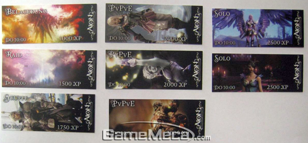 ※명칭 색상별 레어도: 일반(검은색), 희귀(녹색), 레어(파란색) Party, PvPvE, Raid 카드는 매 쇼마다 매우 적은 개수만 배포되기 때문에 그 레어도가 클 것으로 예상됩니다. 또한 Solo 카드는 퀘스트 자체가 수월하고 경험치가 큰 만큼 수량이 가장 적게 배포될 예정입니다. 레어도가 높은 카드들은 경험치 보상도 많습니다. 그러나 공짜로 경험치 보상이 높은 것은 아닐 터, 이 세 종류의 레어 카드를 받은 "선택받은 유저"들은 아이온 부스의 메인 스테이지로 초대받아 단체로 아이온을 플레이하게 됩니다. 각 주제에 맞게 파티플레이, PvPvE, 레이드를 단체로 경험하면서 이 모습이 스테이지를 통해 다른 관람객들에게 중계될 것입니다. 단, 이 퀘스트를 완료하려면 반드시 해당 쇼에 참가해야만 합니다.