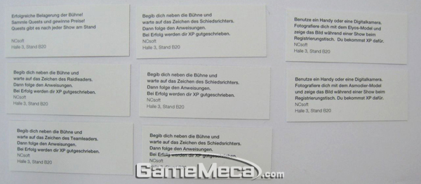 이번 NC유럽팀의 아이온 부스 주제는 바로 "퀘스트"입니다. 아이온 부스에 방문한 유저들은 도우미들이 나눠주는 [퀘스트 카드]에 적혀진 플레이 주제에 따라 게임 플레이를 진행하게 되고, 해당 주제에 맞는 행동을 완료한 만큼 [퀘스트 카드]에 적힌 경험치 점수가 누적되어 가장 많은 점수를 모은 유저가 NC유럽팀이 준비한 상품을 가져갈 수 있습니다. 이는 매 시간마다 빠지지 않고 [퀘스트 카드]를 모아 아이온을 플레이하여, 가장 많은 개수의 [퀘스트 카드] 목표를 완수한 유저일 수록 순위권에 진입할 수 있는 가능성이 높은 것이죠.