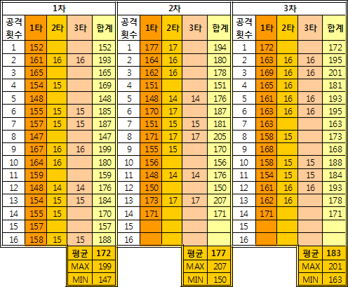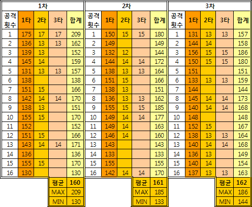 봉혼석을 사용하지 않았을 경우 평균 160~163의 평타 대미지