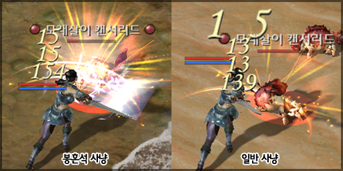 봉혼석을 사용했을 때와 사용하지 않았을 때의 대미지를