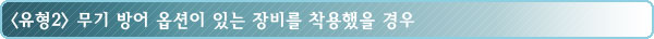 유형1과 동일한 이름의 장비에 무기 방어 옵션이 붙은 아이템으로 세팅했다. 유형1에서 바뀐 건 무기와 투구뿐. 유형1에서 무기 방어 +4, 투구는 물리 방어 -2밖에 되지 않으므로 오차는 거의 없다고 생각한다. 타락한 기사의 단도와(무기방어 379 + 무기 옵션 *2), 방어구를(상의 36 하의 22 어깨 13 신발 13 장갑 14 모자 18 허리띠 14) 사용해 총 990의 무기 방어의 수치로 실험하였다.