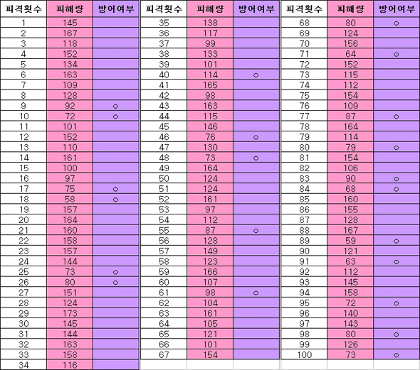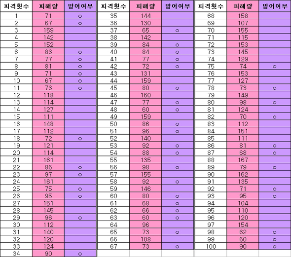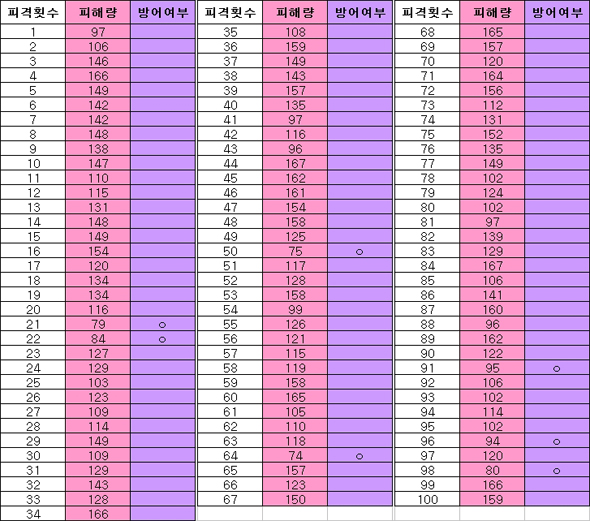 놀랍게도 무려 47% 확률로, 거의 두 번에 한번 발동했다. 유형1과 유형3의 총 피해량 차이는 2044. 그렇다면 기대할 수 있는 1회당 피해 감소량은 20.4, 이걸 퍼센트로 환산하면 약 15.8%의 효과를 받는 셈이다. 살성의 방어율이 이 정도인데 검성의 `체력 강화`, `방어 준비`와 호법성의 `방패의 진언`, `집중 방어` 스킬을 활용하면 더 높은 방어율을 보일 수 있을 것이다. 피해 감소율도 더 많은 횟수로 실험하면 40%에 근접하게 나올 것이라 생각된다.