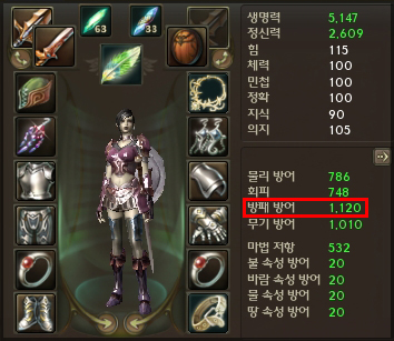 기존의 방패를 좀더 높은 레벨대의 방패로 바꿔 132의 방패방어를 더 올려보았다. 스탯창에 출력된 방패방어량은 1,120였다.