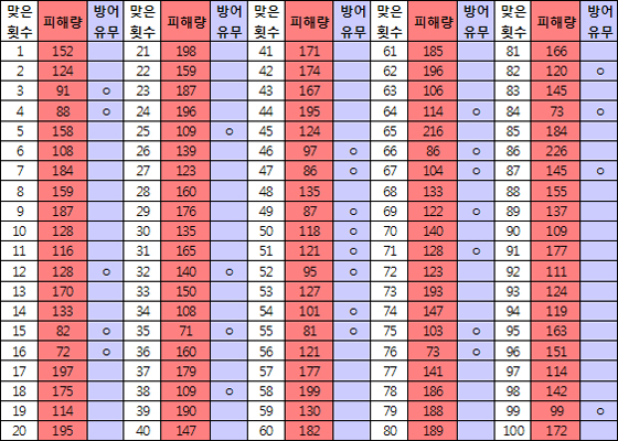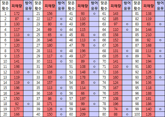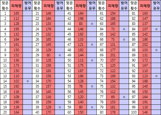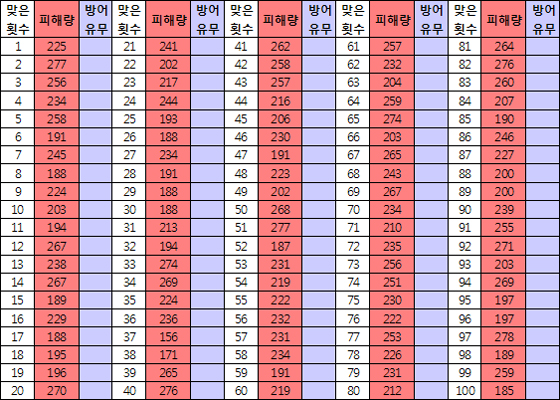 수치가 더해지자 드디어 방패방어가 발동하기 시작했다. 988의 방패방어로 100회 동안 총 14회의 방패방어가 발동한 것이다. 하지만 이것도