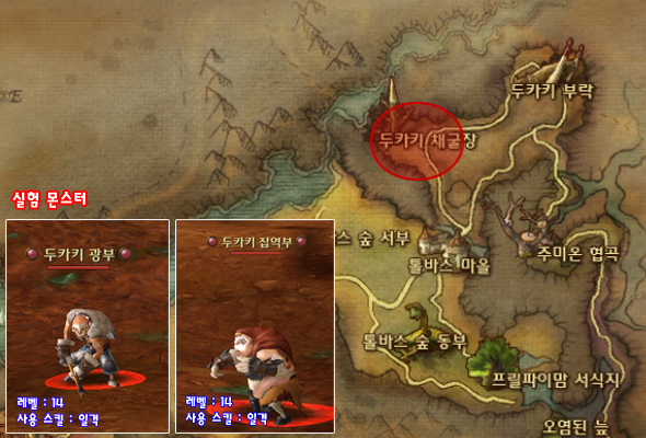 실험은 베르테론 북쪽의 두카키 채굴장에서 이루어졌다. 실험 대상 몬스터는 두카키 채굴장에서 많이 볼 수 있는14레벨 몬스터 `두카키 잡역부`와 `두카키 광부`를 상대로 하였다.