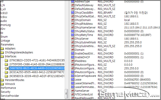 [HKEY_LOCAL_MACHINE/SYSTEM/CurrentControlSet/Services/ Tcpip/Parameters/Interfaces/IP가