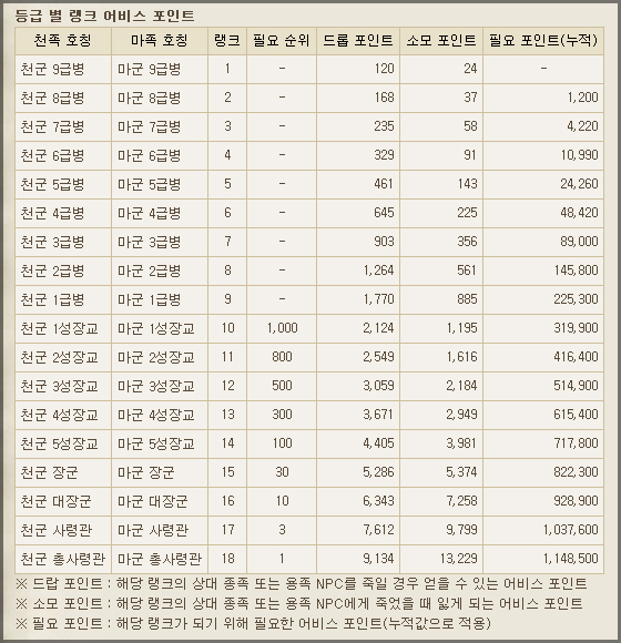 어비스 랭커 스킬은 한 진영당 144명, 천,마족 진영 합쳐서 모두 288명만이 사용할 수 있다. 하지만 이 랭커 스킬은 어비스에서만 사용이 가능하기 때문에 상위 랭커들은 어비스에서만 전투를 벌이게 된다. 왜? 몬스터, 상대 진영의 NPC, 유저들을 장난감 가지고 놀 듯 쉽게 싸울 수 있는데 누가 어비스를 벗어나려고 할까? 덕분에 어비스에 수호신장 유저들이 접속하기라도 하면 어비스 등급이 상대적으로 낮은 유저들은 어비스를 떠날 수밖에 없다.