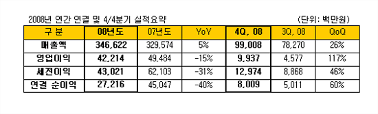 감소했다. 2008년 4/4분기는 연결매출 990억원, 연결영업이익 99억원, 연결세전이익 130억원, 연결 순이익 80억원을 기록했다. 이는 전분기