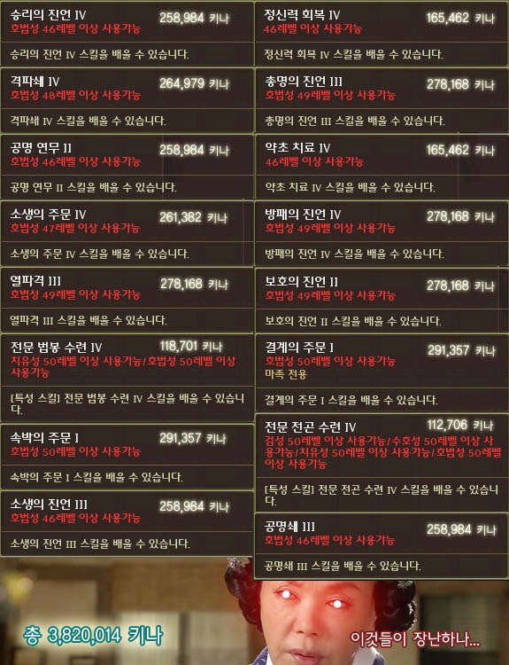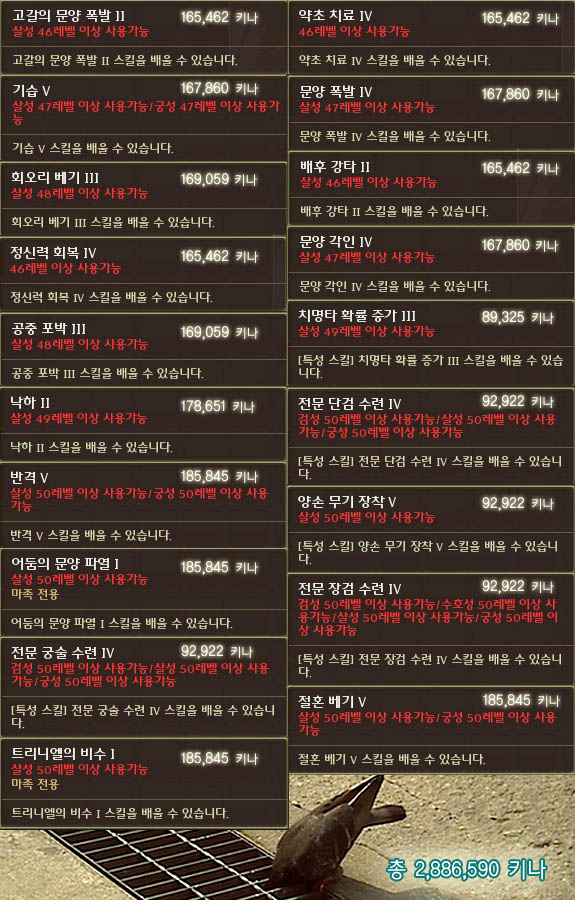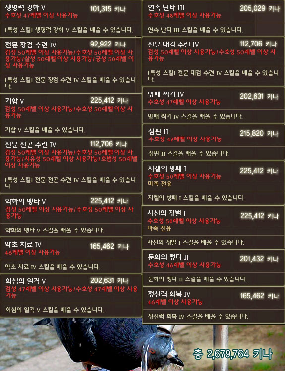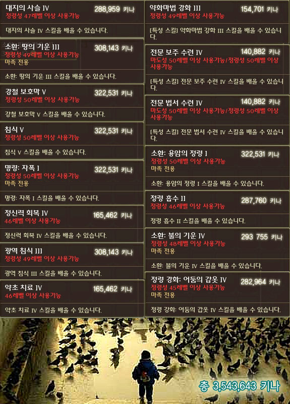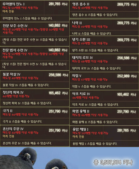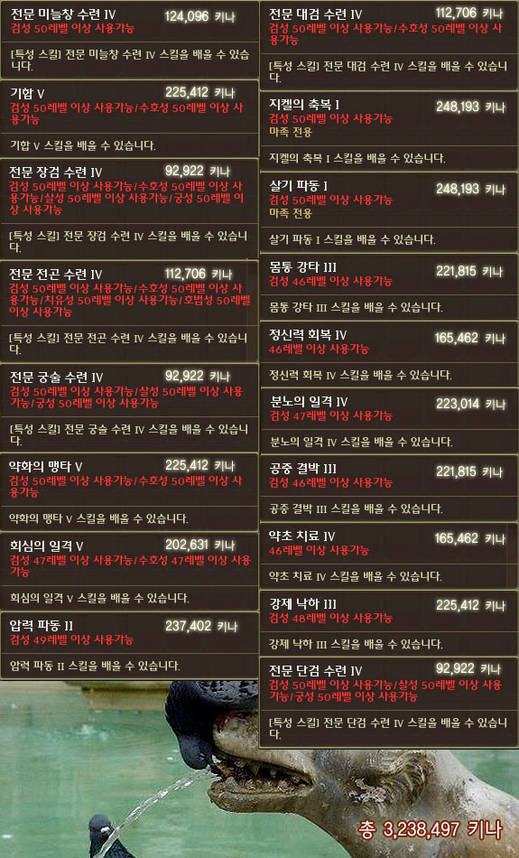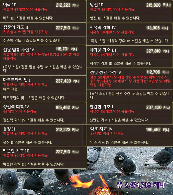 어찌된 영문인지 치유성과 호법성의 스킬북 가격은 무려 100만 키나가 넘게 차이가 납니다. 배우는게 많아서 좋아해야 할지 소외받는거 같아 슬퍼해야 할지 모르겠지만 판단은 유저들의 몫이겠지요.