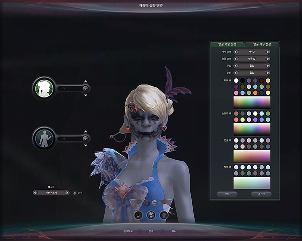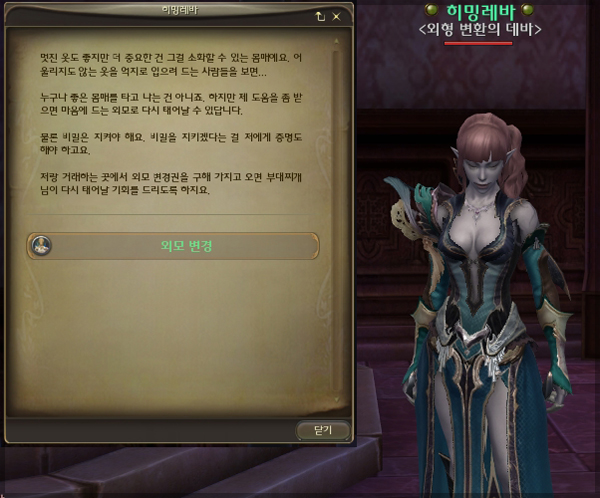 외형 변경의 데바에게 말을 걸고 `외모 변경`을 클릭하면 바로 커스터마이징 화면으로 전환되는데 아직까진 부가서비스만의 서비스는 구현되지 않았습니다. 차후 헤어스타일이나 문신등 다양한 커스터마이징이 구현되었으면 하는 바람입니다.