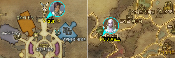 엘리시움의 레아에게 말을 걸면 엘테넨 랑크스 고원에 있는 아이올로스를 찾아가라고 한다. 만약 랑크스 고원에 저장되어 있다면 바로 귀환 스킬을 쓰자. 그렇지 않다면 비행이동을 통해 이동하고 걸어가자. 아이올로스는 결계탑 2층에 있다. 그러나 아이올로스를 찾아가면 자신도 못 찾았다며 엘리시움의 파오룽을 찾아가라 한다. [tip] 미리 엘리시움 귀환 주문서를 2장 사두는 것이 좋다.