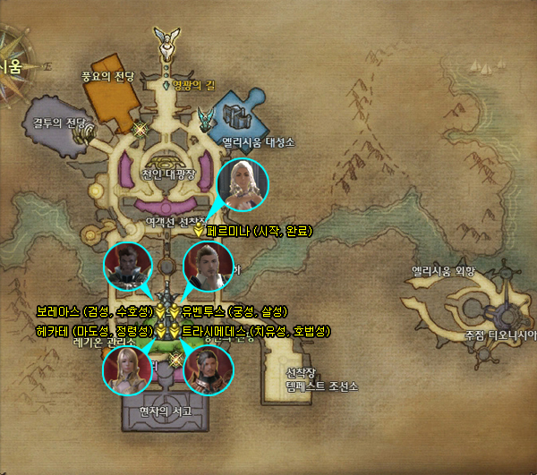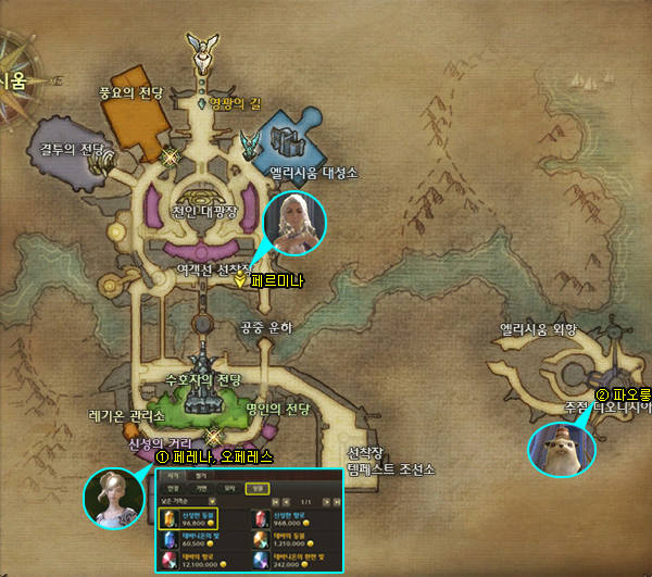 엘리시움으로 돌아와서 파오룽에게 가기 전에 `신성한 등불`을 사자. 파오룽을 만나려면 여객선 선착장에 있는 비공정을 타야 하므로 미리 사면 시간이 단축된다. 즉, `신성의 거리에서 신성한 등불 구매 -> 파오룽 -> 페르미나`를 거치면 퀘스트가 완료된다. 이후 바로 `현자의 가르침` 퀘스트가 진행된다. [tip] 순간 이동 석상을 이용하면 신성의 거리까지 가는 시간을 단축할 수 있다. 만약 파오룽을 만나고 나서 돌아올 비공정을 놓쳤다면 엘리시움 귀환 주문서를 사용하자.