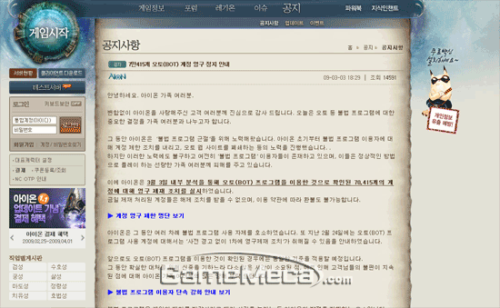 [아이온: 영원의 탑> 뉴스] 엔씨소프트가 3일 ‘아이온’에서 오토계정으로 확인된 계정 7만여 개를 영구정지 하는 조치를 단행했다. 엔씨소프트트는 3일 `아이온` 공식 홈페이지를 통해 ‘내부 분석을 통해 확실히 오토(BOT) 프로그램을 이용한 것으로 확인된