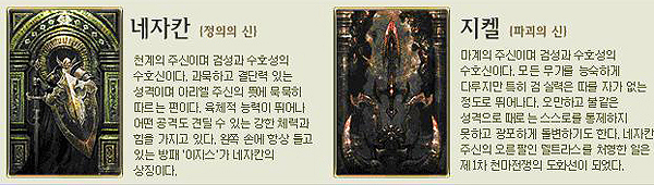 마계로 가게 된 천족의 군단장 델트라스는 처음 만난 마족을 보고 적대심을 느껴 주저없이 베어버립니다. 반면 마족의 아칸은 호기심을 느껴 대화를 시도하려 했었습니다. 하지만 아칸이 델트라스에게 당하고 결국 마족의 기록에는 델트라스의 침략으로 기록이 됩니다. 당시에 의도치 않게 마계에 도착한 델트라스가 만난 주신이 지켈이 아니라 마르쿠탄이나 바이젤이었다면 그리고 그가 현명하게 대처했더라면 천족과 마족이 서로 적이 되어 죽이기보다는 같이 공존하는 방법을 모색하는 방향으로 이야기가 흘렀을 수도 있었을거라는 생각이 듭니다.