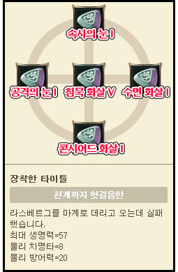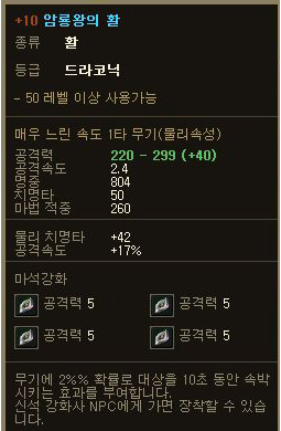 3위를 하신 헬코니님의 무기와 스탯입니다. 무섭게 생긴 암룡왕의 활에 콘시어드 화살을 맞으면 정말 아프겠죠?