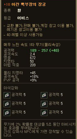 2위를 하신 나나영우님의 스탯과 무기입니다. +10 아칸 백부장의 활을 소지하고 계시네요. 딜사이클이 한번 돌때마다 한명씩 쓰러질것 같은 분위기가 느껴집니다.