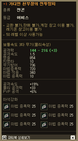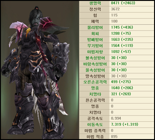 3위를 하신 천족대표님의 장비와 스탯입니다. 지켈서버에서는 마주치는 것을 두려워 할 정도로 명성이 자자한 분 이더군요. 방어구 대부분이 천부장과 백부장 세트로 마도성 상위 1%의 위용을 자랑합니다.