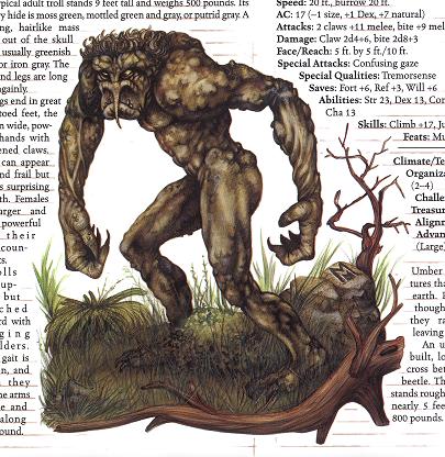 트롤은 열대의 정글에서 혹한의 극지까지 모든 지역에 걸쳐 서식하는 혐오스러운 종족이다. 이들은 두려움을 모르며 끊임없는 탐욕으로 다른 종족을 공격하기 때문에 대부분의 생명체들은 이들을 피해 다닌다. 트롤은 게걸스러운 식욕을 가지고 있으며 작은 동물에서부터 곰처럼 큰 종류, 심지어 사람조차 먹어치운다. 다른 종족의 정착지 근처에 둥지를 틀고 거주자들의 마지막 한명을 먹어치울 때까지 사냥을 계속하는 습성을 가지고 있다. 일반적으로 다 자란 트롤은 키가 9피트에 달하며 (1피트 =30.48 Cm) 몸무게는 500파운드 (1파운드 = 0.45Kg)정도 나간다(환산해보면 키는 약 3미터에 몸무게는 230Kg정도). 고무같은 피부는 이끼색, 반점이 들어간 녹색과 회색, 혹은 지저분한 회색을 띄고 있다. 머리카락 비슷한 뒤틀리고 헝클어진 털이 머리에 대량으로 자라나 있으며 대부분 흑녹색이나 연회색 빛깔을 띄고 있다.