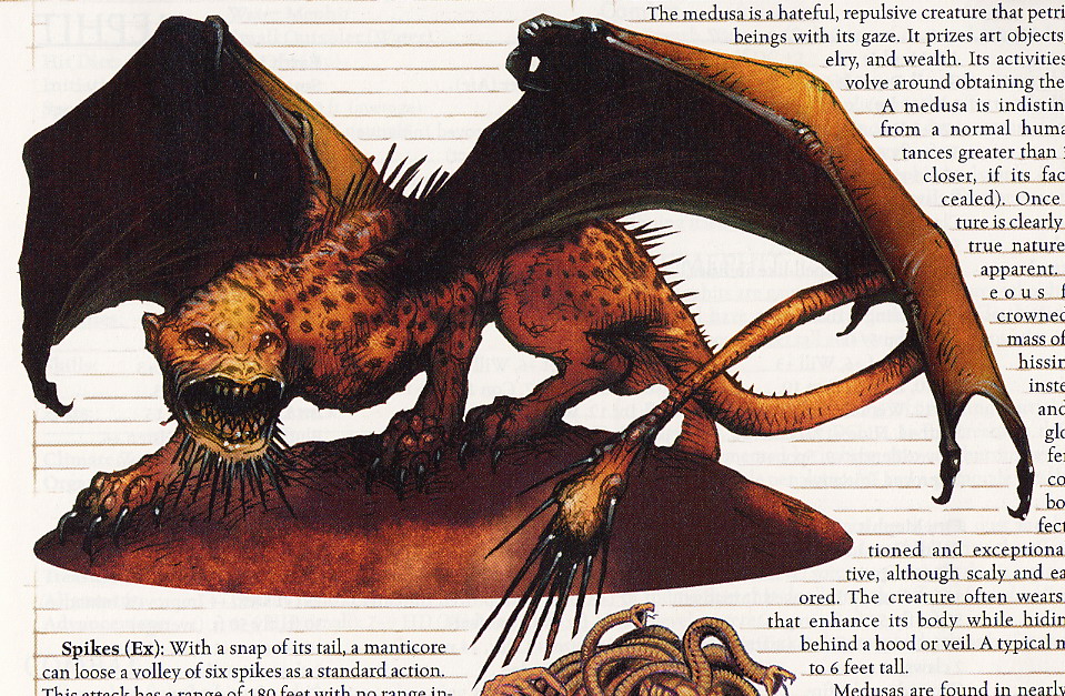 맨티코어와 닮은 비행수단을 오크족 케릭터가 이용하고 있는 모습이다. 어떻게 보면 워크래프트 3에 등장했던 와이번과 흡사해 보이지만 목 부분의 사자갈퀴나 발의 모양으로 봐선 맨티코어라고 판단하는 게 옳을 것 같다. 맨티코어의 모습은 판타지 세계관에 따라 약간씩의 차이를 보인다. 일반적으로 인간과 사자, 용의 특성을 혼합한 형태를 띠고 있으며 독을 함유한 가시를 지녔다는 점 역시 공통된 부분이다. 맨티코어는 외모와 다르게 매우 이성적인 생명체이며 냉철한 판단으로 상황을 파악한다. 때문에 맨티코어를 적으로 돌리는 것은 매우 위험하다(하지만 기본적으로 사악한 생명체이기 때문에 얼라이언스가 맨티코어와 친해지기는 어렵지 않을까).