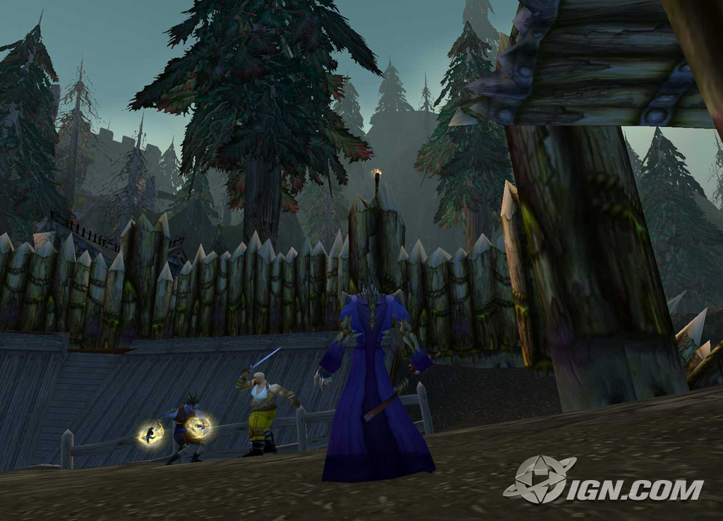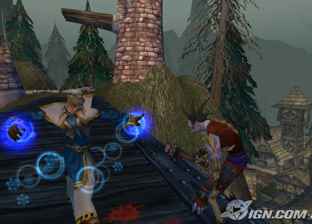 인간 마법사와 언데드 전사 케릭터가 전투를 벌이고 있다. 마법사 케릭터는 냉기계열의 마법을 외우고 있는 것으로 보이며 상대적으로 언데드 케릭터는 레벨이 아직 낮다. 피해 상황에 따라 일정 수준의 선혈이 묘사됨을 알 수 있다. 아래쪽에 보이는 마을은 중립지역이거나 혹은 인간마을일 것으로 예상된다.