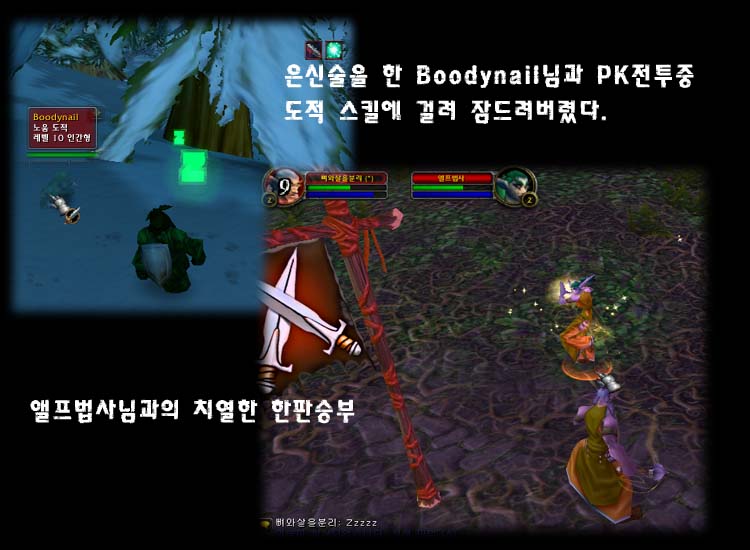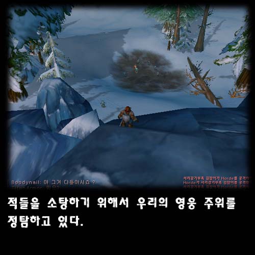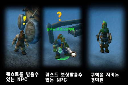 * WOW는 수십 가지의 자그마한 퀘스트들로 구성되어있습니다. 게임에 몰입하다보면 마치 "어드벤쳐 게임 같다"라는 착각이 문뜩 떠오릅니다.이것이 바로 WOW만의 독특한 매력인거 같습니다. NPC또한 살아 있는듯 표범은 약한 토끼들을 잡아먹습니다. 구역을 지키는 경비원NPC들은 마을이나 길가를 순찰하며 맹수나 야수들이 접근하지 못하도록합니다. 맹수들이 달려들때 순찰대에게 다가가면 도와줍니다.(대신경험치나 아이템은 먹지 못합니다.)
