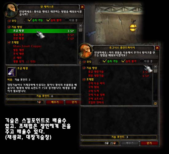 *부가적으로 직업(낚시꾼, 광부. 대장장이, 요리사, 약초꾼, 기술자 등등)을 가질수 있고 스킬포인트를 투자할수 있습니다. 아이템을 제조하기 위해서는 직업 숙련도가 높아야하며 고급아이템을 만들기 위해서는 장인 NPC에게 돈을주고 배워야합니다.