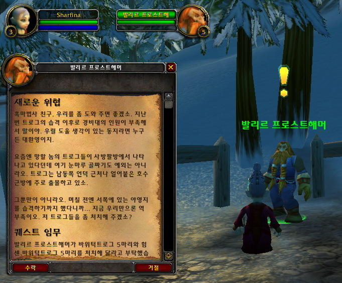 놈 종족으로 흑마법사를 시작했다면 눈마루 골짜기에서 wow의 생활을 시작하게 됩니다. 캐릭터를 처음 만들고 접속하면 바로 앞에 몇몇 NPC들이 보일 것입니다. 그 중에서도 머리 위에 노란색 느낌표를 달고 있는 NPC들은 퀘스트를 주는 NPC입니다. 초반 퀘스트들은 쉽고 간단하며 저레벨때 쓸 모 있는 각종 아이템을 얻을 수 있게 해주므로 지나치지 않고 하는 것이 좋습니다. 게임을 시작하자마자 자기 바로 앞에 서있는 발리르 프로스트해머와 대화하면 [새로운 위협]이라는 퀘스트를 줍니다.