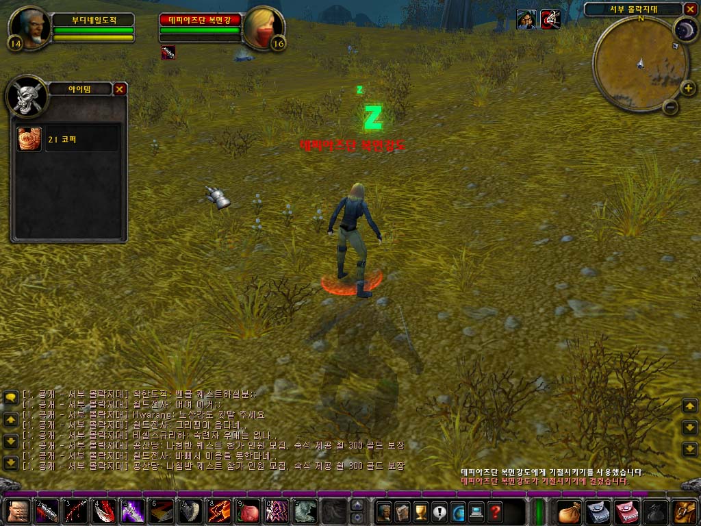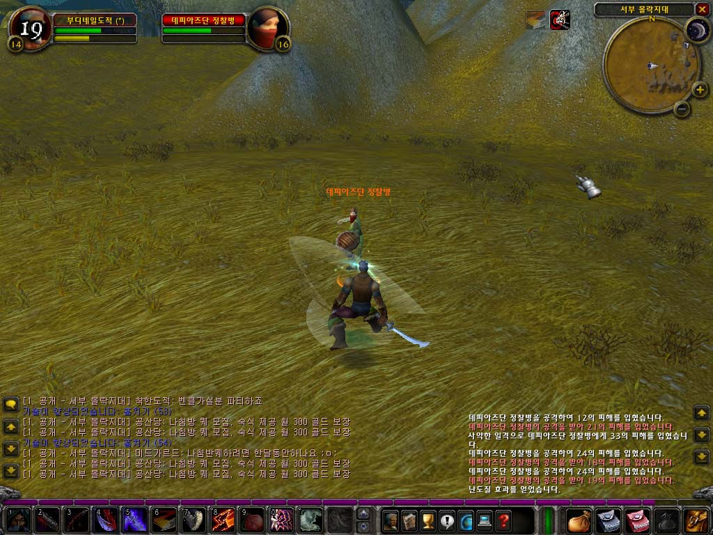 이렇게 되면 본격적인 싸움이 되는데 힘을 올려 어느 정도의 방어력을 갖추었기 때문에 일반 도적보다 유리한 위치에 있을 것입니다. 본격적인 정면싸움이 되면, 사악한 일격을 두 번 정도 먹여서, 연계 포인트를 2점정도 획득합니다. 이때 중요한 것이 저 같은 경우는 마무리 기술을 절개를 사용하지 않고, 검의 공속을 보완하기 위해서 난도질을 사용합니다.(난도질은 일정시간동안 공속을 빠르게 해주는 기술입니다.) 이렇게 되면 거의 한 틱(tick)당 3번의 연타를 낼 정도로 빠르게 나갑니다. 평균 사악한일격 데미지가 현재 40, 50나오고 치명타가 터질 경우는 70~90정도 가까이 나옵니다. 이정도 기술을 먹여주면, 한두 레벨 상위의 몹은 쉽게 잡을 수 있습니다.