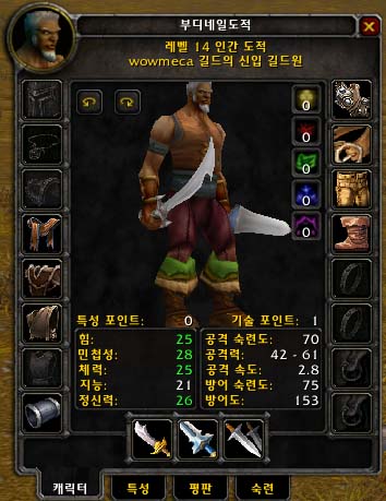 우선 명중률이 떨어집니다. 민첩성에 투자한 기존의 도적에 비해 명중률이 떨어지는 것이 눈에 보입니다. 하지만 이것은 위에 제가 가정했던 것이 맞는다면, 레벨이 올라가게 되면 민첩성에 따른 스텟의 영향이 멕스치에 도달하기 때문에, 상위 레벨에서는 비슷해질 것이라고 생각됩니다. (멕스치 이상 넘어가는 스텟의 낭비를 막는 것이죠, 하지만 이것은 상위레벨에서의 가정입니다.)