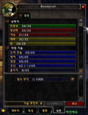 그리고 스텟이외에 들어가는 부분이 보조기술이 있고, 또는 도적으로 치자면 쌍수무기와 같은 특정기술이 있습니다. 쌍수무기를 올리려면 30의 기술포인트가 들어갑니다. 현재 필자는 보조기술을 올리지 않고 있는데 직접적인 전투에 영향을 주는 스텟과 기술을 올리는데에도 기술포인트가 부족하다고 느껴지기 때문입니다. (도적이라면 10레벨 정도가 될 때 기술포인트30을 여분으로 만들어 두셔야 합니다. 아니면 저처럼 별도로 기술포인트 얻는 노가다를 해야합니다 ^^;)