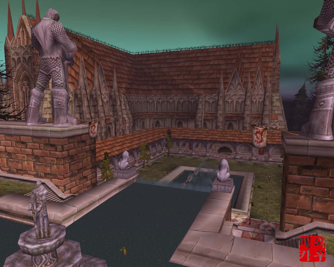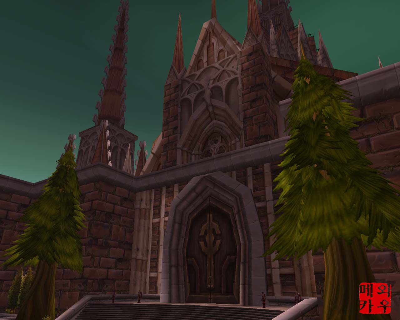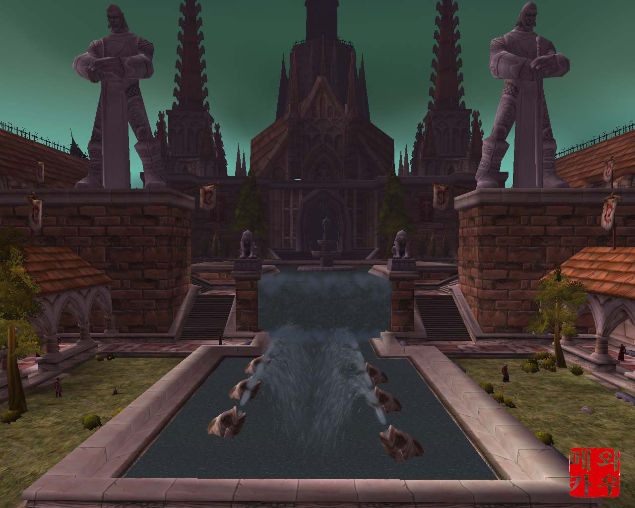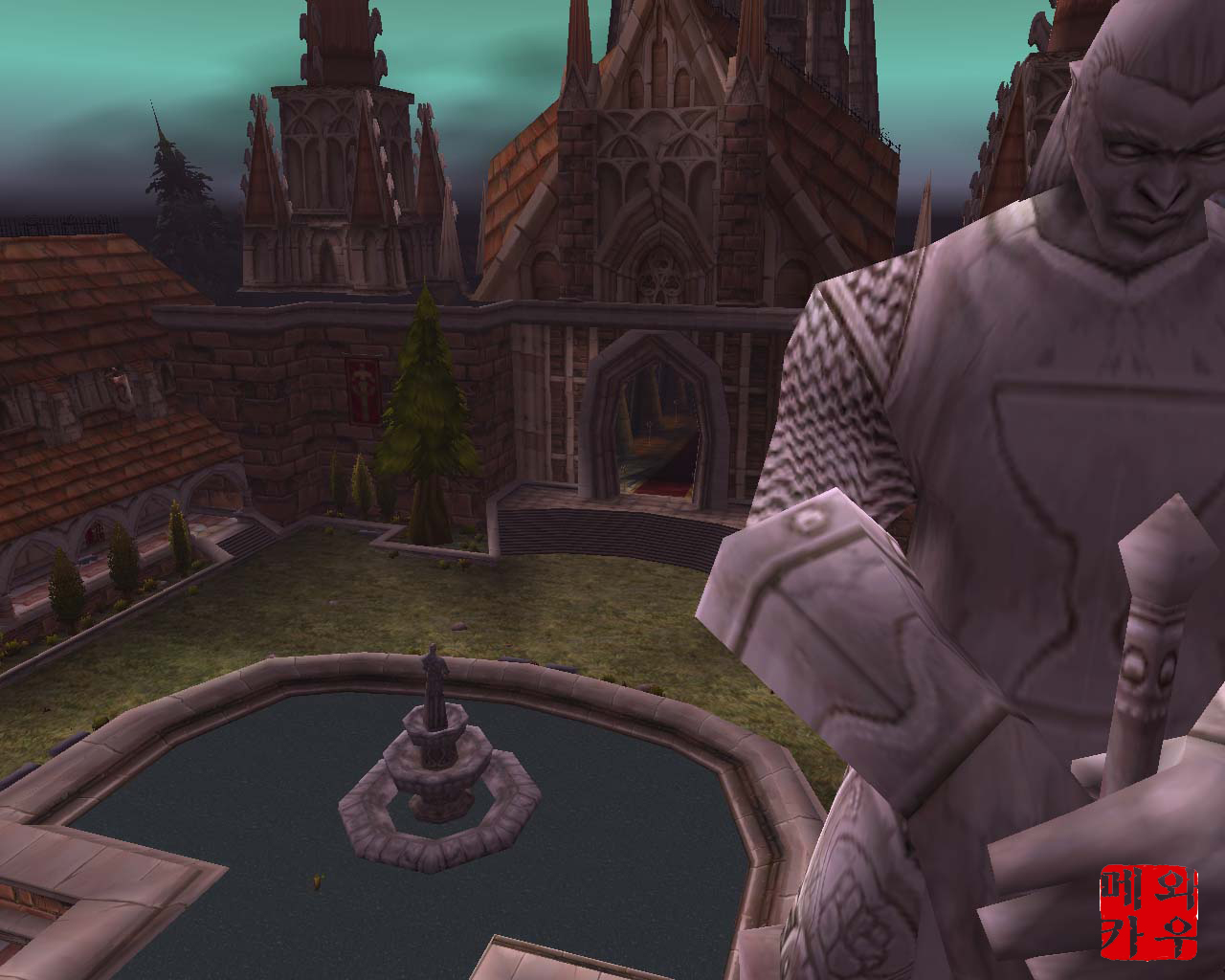 붉은 십자군 수도원의 전경이다. 이곳은 언데드 지역과 인접하여 주변 분위기가 티리스팔 숲과 비슷하다. 수많은 분수대와 석상들로 이곳이 과거 번영했던 곳임을 말해준다.