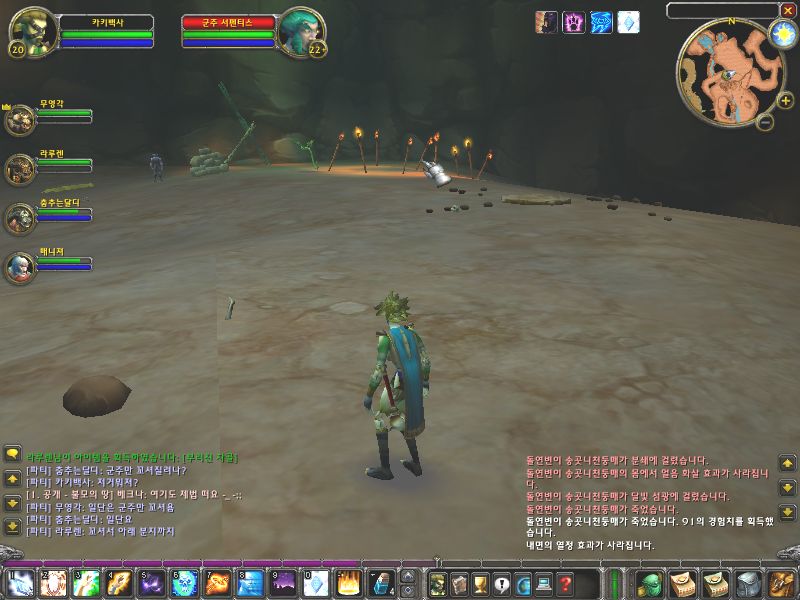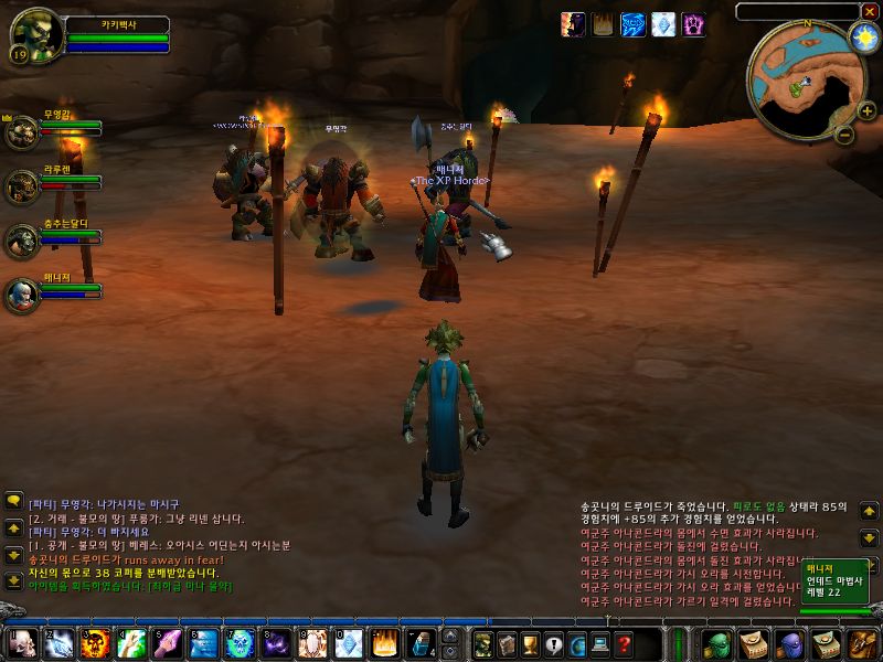 자 드디어 파티에서의 역할을 설명할 때가 된 것 같습니다. 저희는 2명의 전사가 탱커고 드루이드가 풀링, 법사님이 딜링, 제가 힐링~^^을 담당했습니다. 우선 전사 한분이 앞에 서 계시고 그 앞으로 드루이드님이 가셔서 풀링을 해 오십니다. 드루이드님은 한참 도망을 갑니다. 도망가면 쫏아오는 몹을 전사님들이 중간에서 커팅을 해서 잡아 놓습니다.
