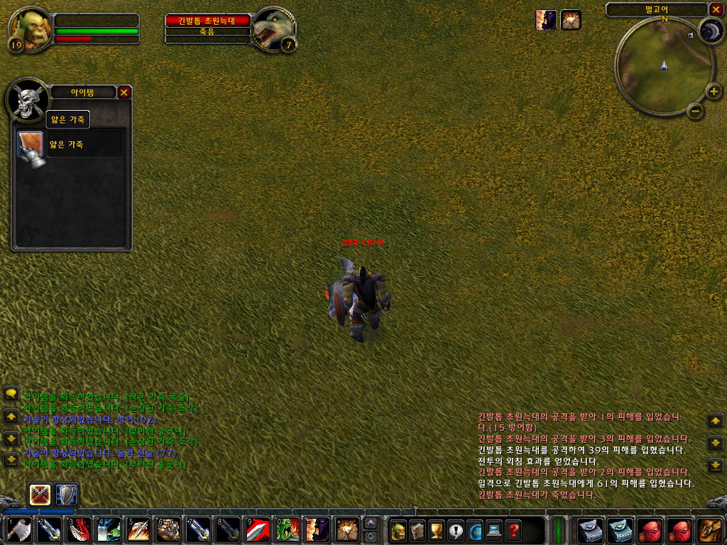 무두질로 초반에 얻을 수 있는 아이템은 손상된 가죽조각과 얇은 가죽입니다. 초기에는 몬스터보다는 동물 위주로 사냥을 하게 되니까 수급에는 문제가 없을 겁니다. 가죽은 다른 사람이 사냥한 야수의 시체에서도 얻을 수 있으므로 필드를 청소해준다는 느낌으로 야수들 시체에 무두 기술을 사용해 줍니다. 손상된 가죽은 20장까지 한 슬롯에 들어가고 얇은 가죽은 10장까지 한 슬롯에 들어가죠.
