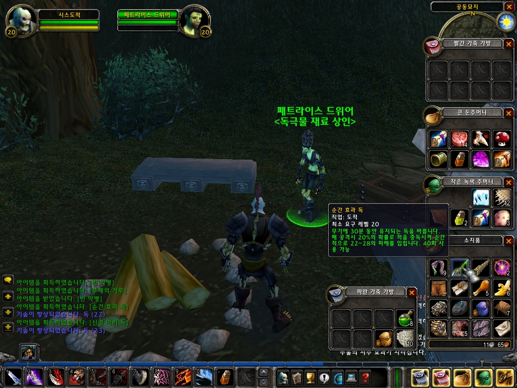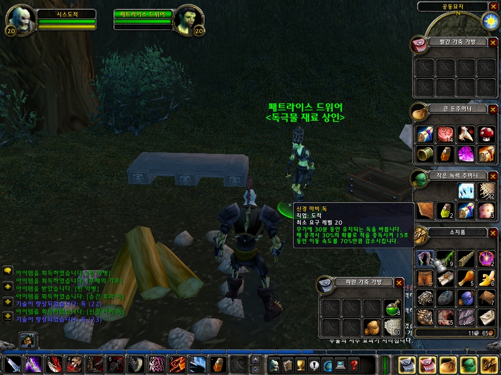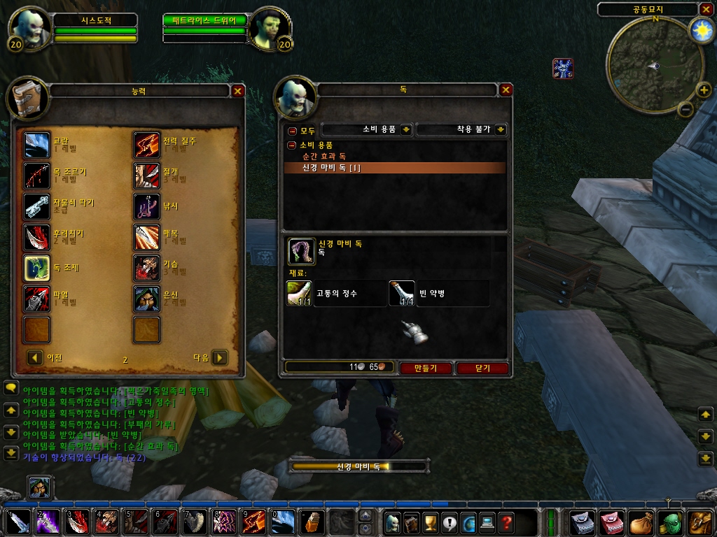 음...이것들을 만들기 위해서는 재료가 필요합니다. 독재료를 파는 NPC에게 가서 재료를 사야하는데요, 순간효과 독은 부패가루 와 빈약병이 필요하구 신경마비 독은 고통의 정수와 빈약병이 필요합니다.