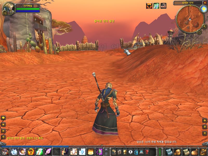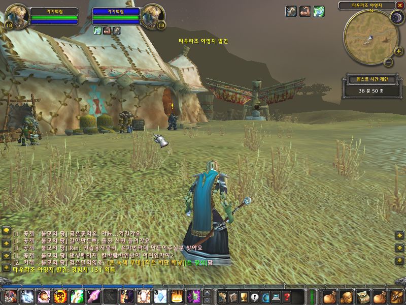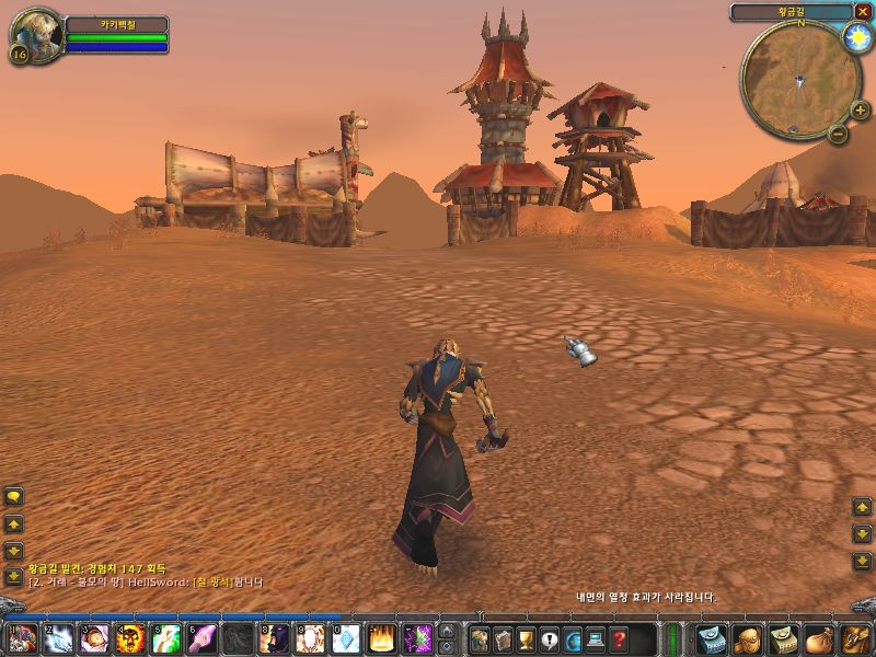 7. 톱니항에서 받은 녹색 퀘스트를 정리하면서 렙업을 하면 새로 녹색 퀘스트가 생기는데 이 녹색 퀘스트를 처리하는 중에 버섯포자라는 퀘스트도 처리하고 연금술사 헬브림에게 가져다 주면 연결 퀘스트로 연금술사 자마라는 퀘스트를 준다. 바로 퀘스트를 받지 말고 마을 여기저기 완료한 퀘스트 정리하고 퀘스트 새로 받고 썬더 블러프를 가야하는 퀘스트가 있다면 꼭 받아 놓는다. 인벤을 비운 후 연금술사 자마라는 퀘스트를 받자. 왜 늦게 받을까? 왜냐하면 시간 제한 퀘스트이기 때문이다. 음..어떻게 보면 시간은 충분한 편인데 처음에 이 퀘스트를 받았을 때 얼마나 떨리던지.. 퀘스트는 썬더 블러프의 연금술사 자마를 찾아가는 것이다. 뛰어서 갔을 때 걸리는 시간은 대략 10-15분정도 소요되는 것 같다. 시간적인 여유는 좀 있으므로 뛰어가는 중간에 타우라조 야영지에서 에체야키라는 퀘스트를 받는다. 그렇게 썬더 블러프까지 뛰어간다.