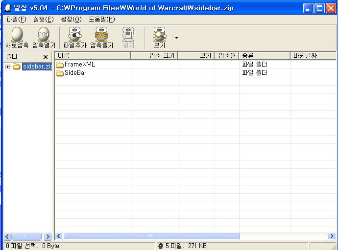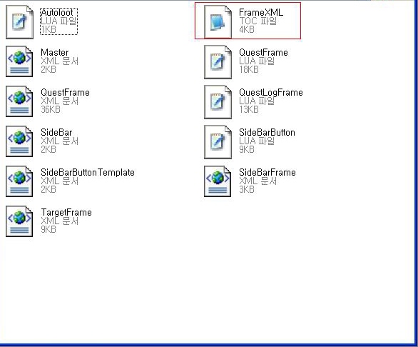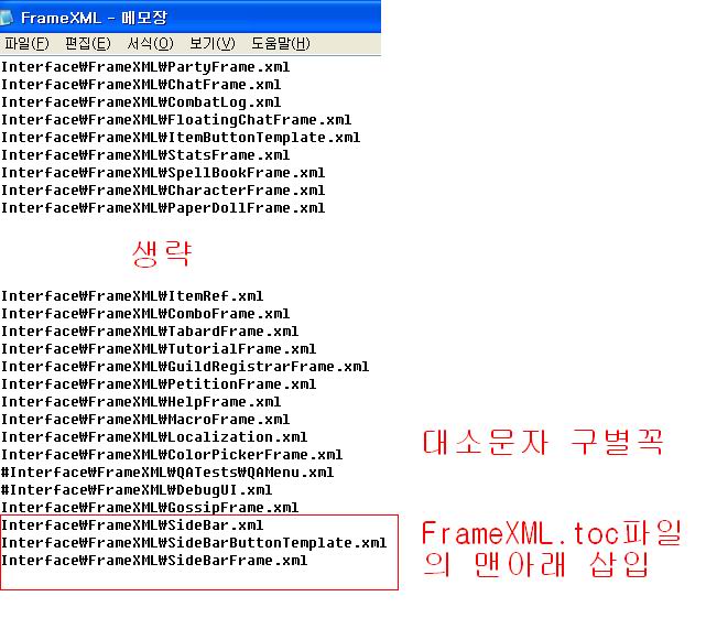 InterfaceFrameXMLSideBarFrame.xml △쓰는게 귀찮다면 위의 3줄을 복사하여 붙여넣기 하자 ★framexml.toc 맨아랫줄은 읽지 않으니 꼭 한줄 띄워준다!★ 7. 접속시 에러나면 interface폴더를 삭제하고..초심의 자세로 돌아가리..