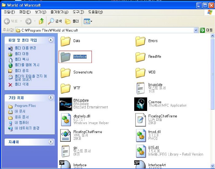 1. 와우설치폴더 (여기선 c:program filesworld of warcraft 이다)를 열어 interface란 폴더가 있는지 확인한다. (있다=다른 인터페이스를 설치한상태이다 // 없다=인터페이스란것은 처음 설치한다)