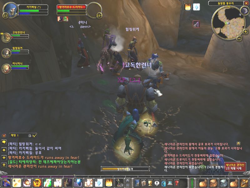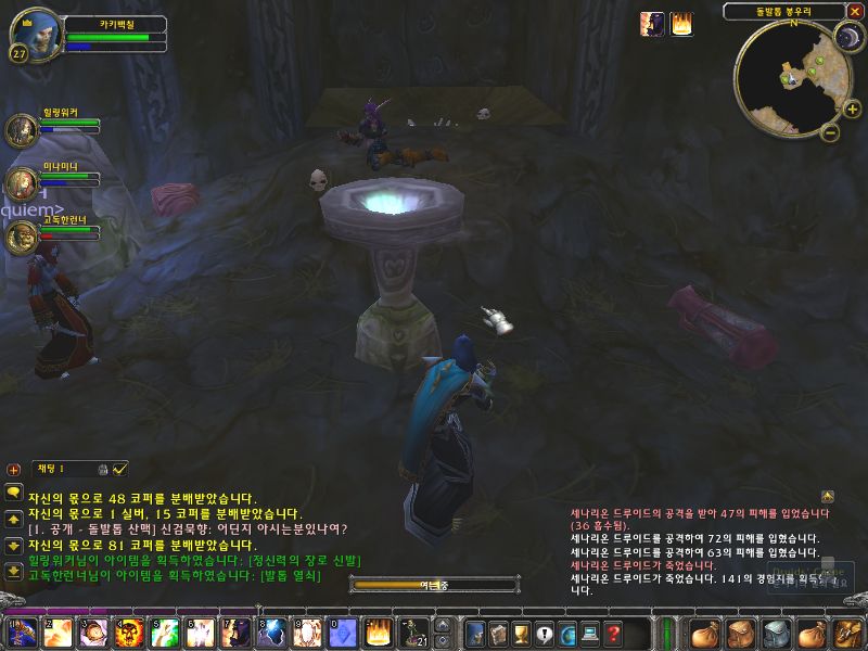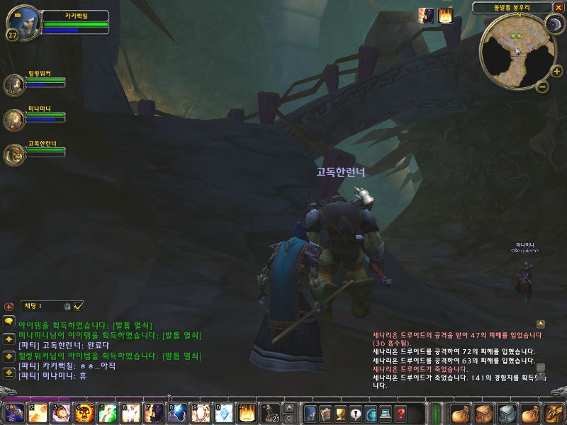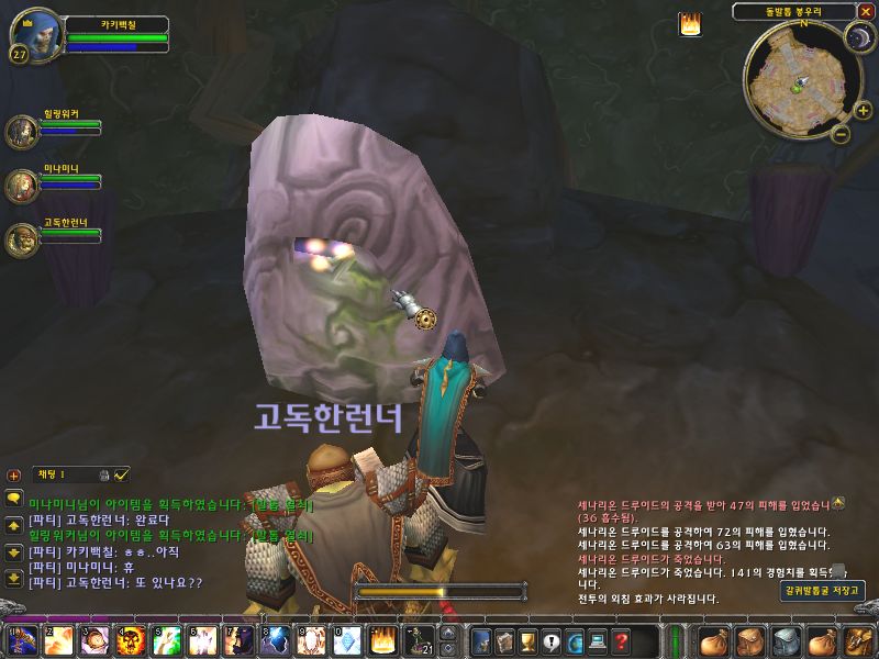 저길로 내려가서 오른쪽으로 가야하는데.. 순찰 병력이 드루이드 2마리가 있고 아래 쪽에도 꽤 많은 몬스터가 있으므로 아래쪽에 있는 몬스터들을 이곳까지 풀링해서 처리한 후에 내려가도록 한다.