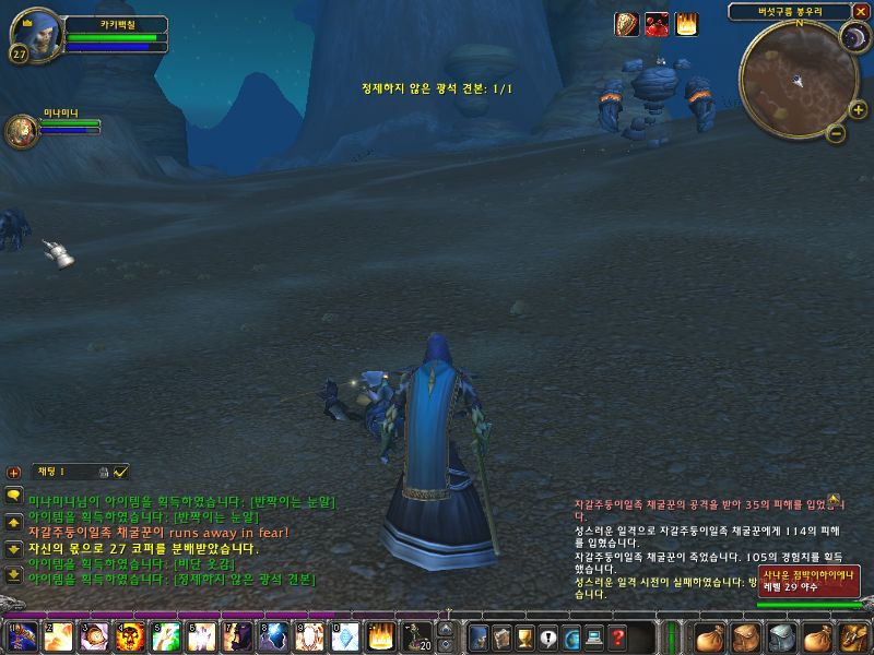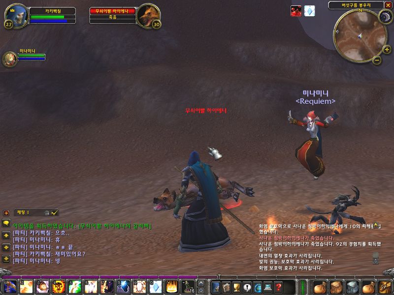 투사를 처치하고 탈출에 성공한 우리는 무쇠이빨 하이에나를 잡기 위해 북서쪽 방향으로 이동을 했다. 북서쪽 방향에서 하이에나를 찾기를 한 10분 정도 하고 있는데 눈앞에 바로 나타난 무쇠이빨 하이에나, 그 옆에는 호위병도 보인다. 일단 작전은 무쇠턱 하이에나를 일점사 하고, 호위병은 공포를 이용해서 도망가게 만드는 것이다. 생각대로 쉽게 무쇠턱을 잡았으나, 호위하는 하이에나가 나에게 공포를 걸어서 이리저리 도망다니니 근처의 하이에나가 나를 보고 달려든다..-0- 그래서 약간 힘들게 모든 처리를 완료했다. 으흐흐..