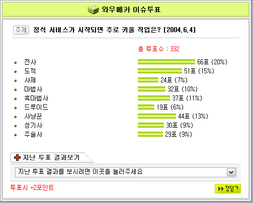 정식 서비스가 실시되면 게이머 여러분들이 직업을 주 캐릭터로 선택할지에 대한 설문조사 결과가 나왔습니다. 이번 조사는 일주일동안 진행되었으며 총 334분의 와우메카 가족여러분들이 참여해 주셨습니다.