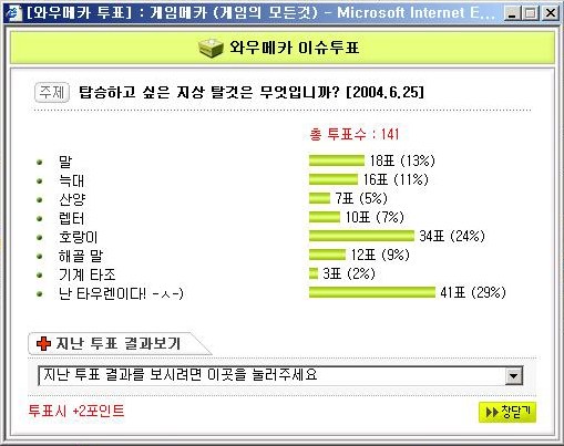 이번 패치에 추가된 탈것에 대한 선호도 설문조사가 일주일동안 실시됐으며 총 141분의 와우메카 가족 여러분들이 참여해 주셨습니다.