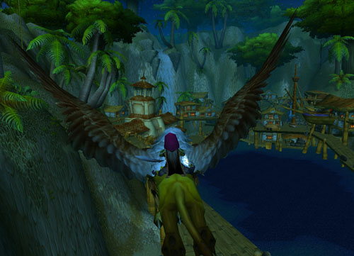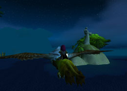 여하튼 저는 스톰윈드에서 일단 무법항으로 가는 그리핀을 탔습니다. 무법항은 아제로스에서 최남단에 있는 항구이기 때문에, 그리핀으로도 아주 오래걸리는 경로랍니다. 그렇지만 주변을 구경하다 보면 따스한 숲에서 점점 기온이 오르는 만큼, 경치도 열대우림으로 변해가는 것이 신기하고 놀랍기만 합니다. 나무 사이사이로는 랩터들도 보이고, 푸르고 짙은 바다도 한쪽으로 펼쳐지구요. 무법항에 도착했을 때는 이미 한밤중이었지요.