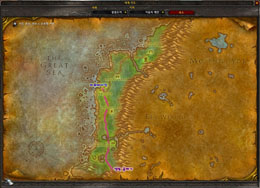 물론 여기까지는 소금평원에 가는 길 중의 아주 일부분입니다. 저야 처음에 인간친구와 위에 말씀드린 여정을 거쳐서 톱니항까지 간 다음, 거기서 무법항으로 갈 수 있었지요. 꽤나 오래된 이야기지만 그때는 황금길을 따라서 나무 밑에서 쉬고 있는 사자들과, 혼자서 황량한 들판을 방황하는 하이에나, 그리고 염소처럼 뿔이 있으며 쳐다볼때 목이 빠질 듯이 아파오는 기린들을 볼 때는 정말 감동했었어요. 길을 따라 가다가 트롤분들이나 타우렌 분들이 손을 흔들어 인사도 해주시구요... 앗, 이럴 때가 아닌데.
