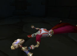 일행들이 살금살금 다가가 과감히 뒤통수를 망치로 때립니다. 와아 와아! 피가 좍좍 다는 것이 보입니다. 쓰러진다 하는 순간, "다들 뒷방으로 들어가요!"라는 소리와 함께 모그레인의 정면에 있었던 문이 열리며 이쁜 언니가 한 명 튀어 나옵니다. 네, 그렇습니다. 뭇 남성분들이 바라마지 않던 화이트메인 언니입니다. -ㅅ-;; 옷도 빨갛고 지팡이도 빨간데, 눈도 빨갛고 입술도 피 묻은 것처럼 빨갛습니다. 전설의 고향입니다. 그런데도 남정네들 화이트메인에게 홀려서 우리를 치기 시작합니다. ㅠ_ㅠ 오오 화이트메인 언니 미모를 이용한 공격! 비겁합니다. 그래 놓고 또 금새 나가서는 다 잡아 놓은 모그레인을 살려놓습니다(아시죠? 화이트메인이 모그레인을 살려놔야 모그레인을 완전히 죽일 수 있습니다. +ㅅ+/). 왠지 얄밉습니다. 저를 비롯한 여성분들은 화이트메인에게 달려가 머리카락을 쥐어 뜯으며 "모자내놔! 지팡이 내놔!"를 외치고, 질투의 화신이 된 남성분들은 모그레인에게 달려가 "방패내놔! 이 운 좋은 놈!"을 외치며, 모그레인을 패기 시작합니다. -ㅅ-;; 이렇게 해서, 화이트메인과 모그레인은 한 날, 한 시에 사이좋게 승천하였습니다.